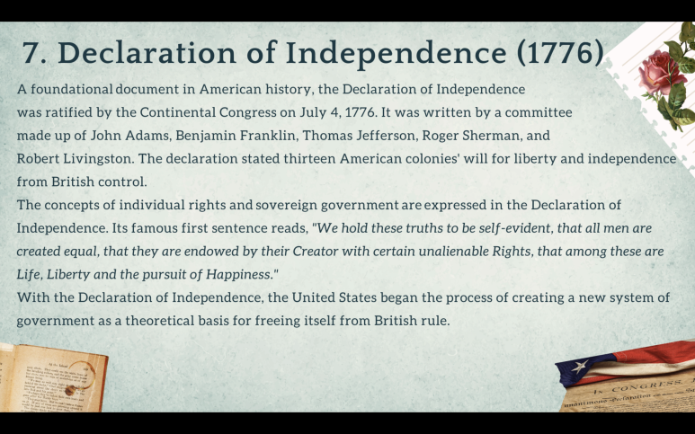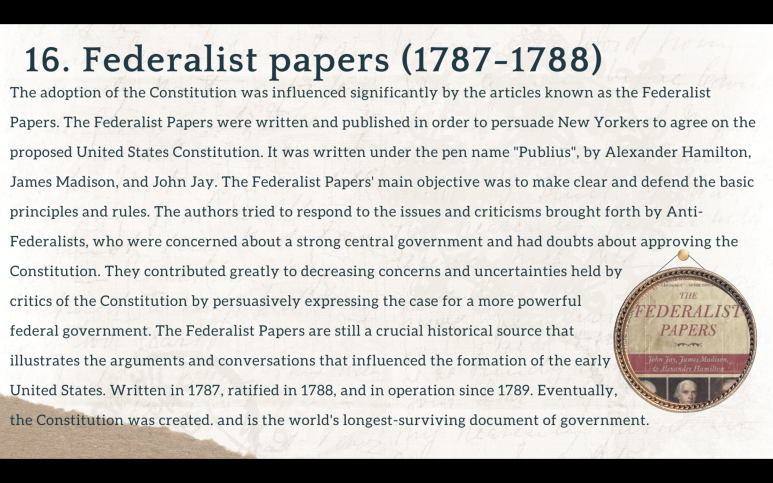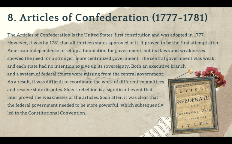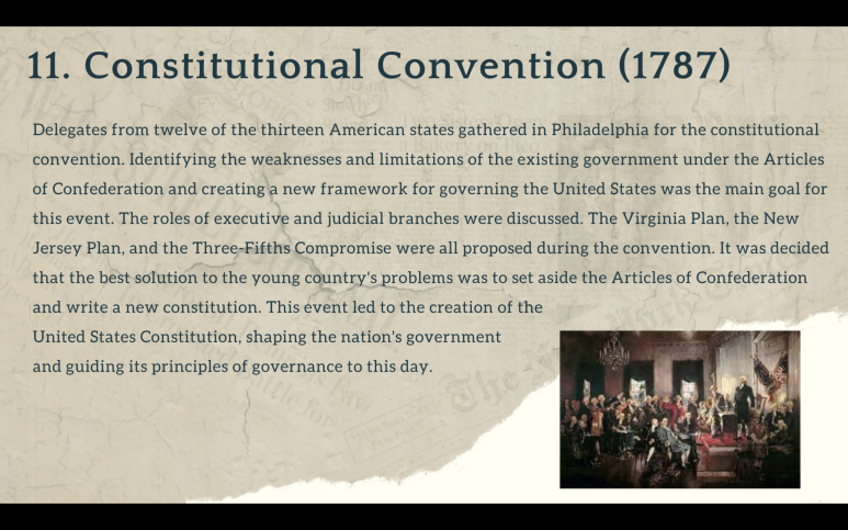 I realized it is crucial to know about the context of the US government before I learn anything (present) about it. The US is an interesting country for many reasons, but also because considering its political/economic status, it surprisingly was established not too long ago. I made a PowerPoint to organize how the constitution, which has the most power in this country, was created/amended. This helped me a lot during the school year, and I hope it can help others as well.